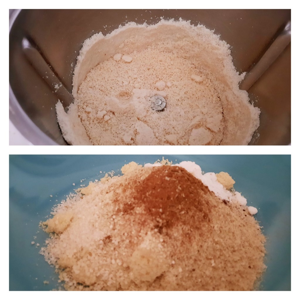 Para hacer la harina he triturado 100 g de copos de avena y 100 g de almendra pelada. Le he añadido (esto es opcional) 2 cucharadas soperas de psyllium para que quede más esponjoso, ya que la harina no contiene apenas gluten. Recuerda que la almendra no tiene gluten , pero la avena sí, aunque muy poco.