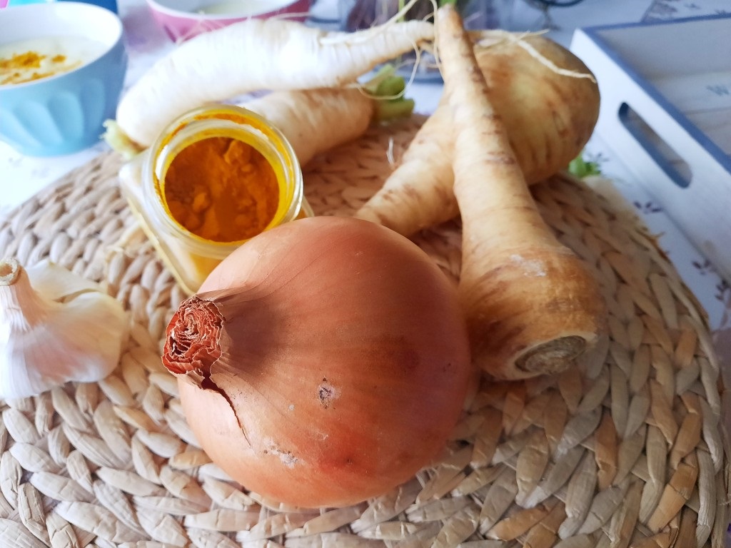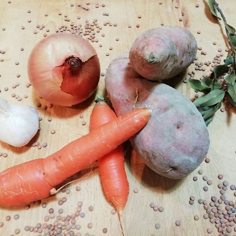 - Calabaza, zanahoria, romero, lentejas rojas con cúrcuma y pimienta.